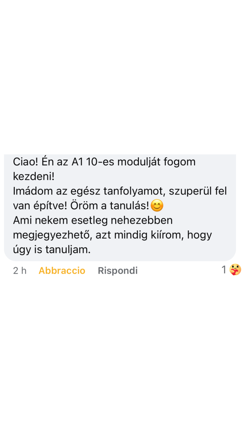 Olasz nyelvtanárodként mindig az lesz a célom, hogy vezesselek, és segítsek legyőzni a félelmeidet, hogy könnyedén megértsd a nyelvet, és hatékonyan tudj kommunikálni. Segítek megtalálni a számodra megfelelő rendszert, az erősségeidnek és nehézségeidnek megfelelően, miközben lehetővé teszem, hogy feltérképezd a céljaidat és gyakorold a tanultakat.